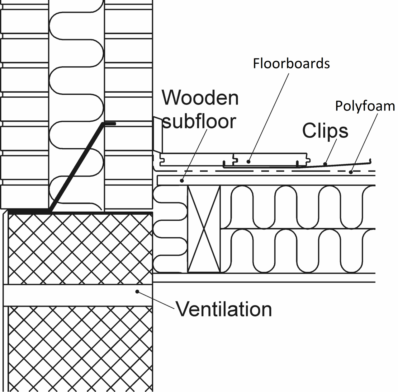 On wooden subfloors above ventilation spaces Junckers PolyFoam can be used as an intermediate layer, providing that the space is ventilated effectively and that the underside of the insulating layer is open to diffusion.