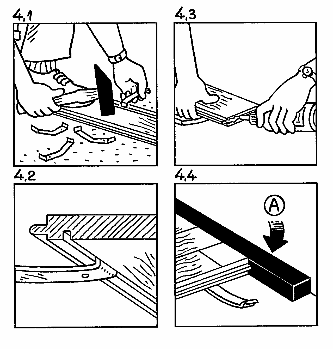 It is recommended that the floorboards are laid parallel with the longest side of the room. Turn the floorboard over and tap the end of the clip with the hole(s) into the groove on the back of the floorboard, so that the plain end of clip points in the direction of the tongue, which is the laying direction (Fig. 4.1 and 4.2).