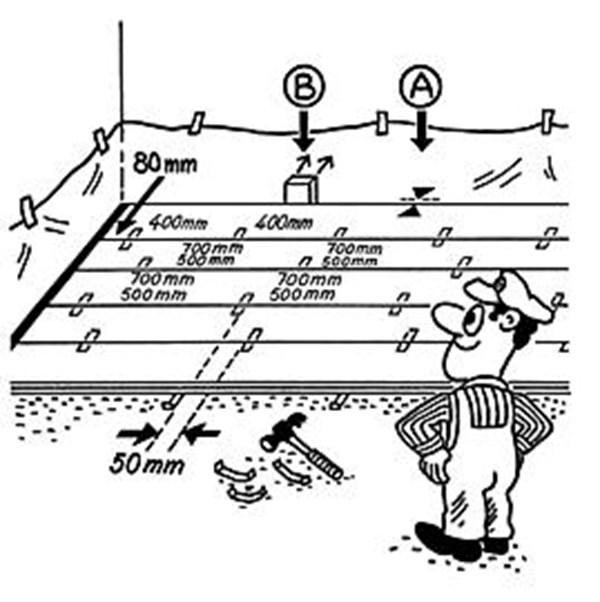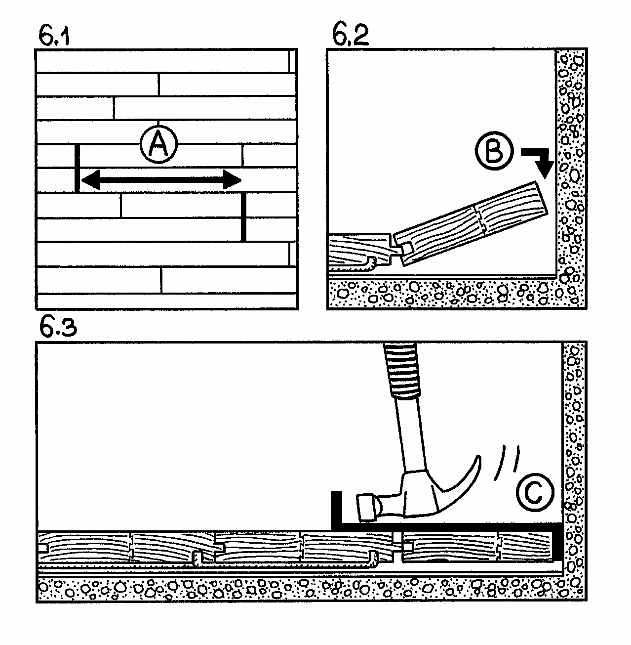 Lay the floorboards to a random pattern. Distribute the header joints as far apart as possible. However, the distance (A) between floorboard joints in two successive rows should be at least 250 mm (9 13/16″)(Fig. 6.1).
