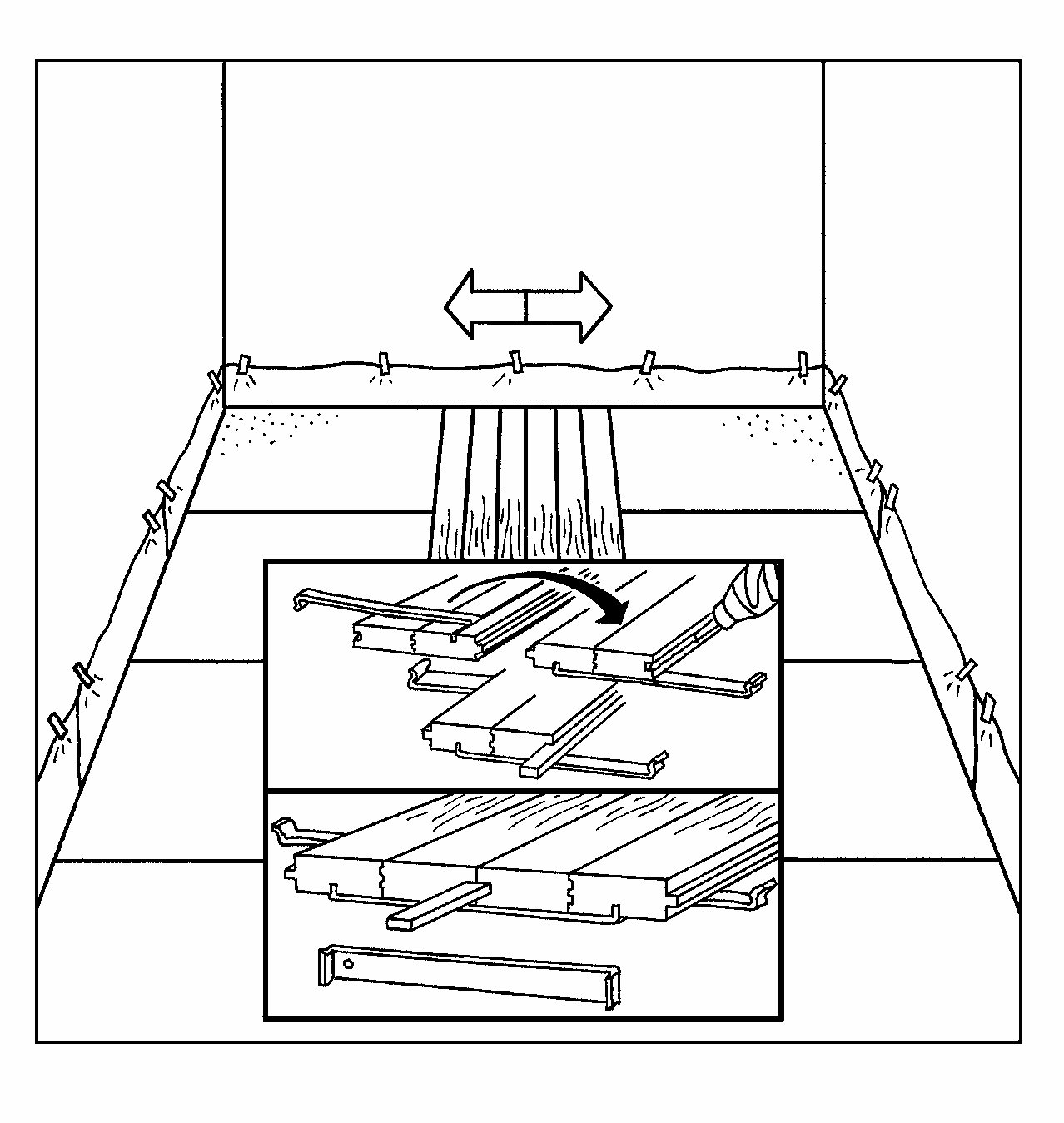 Clips must be staggered (in line) by approx. 50 mm (2''). Use temporary spacers or wedges between the wall and the first row of floorboards to form the expansion gap (B).