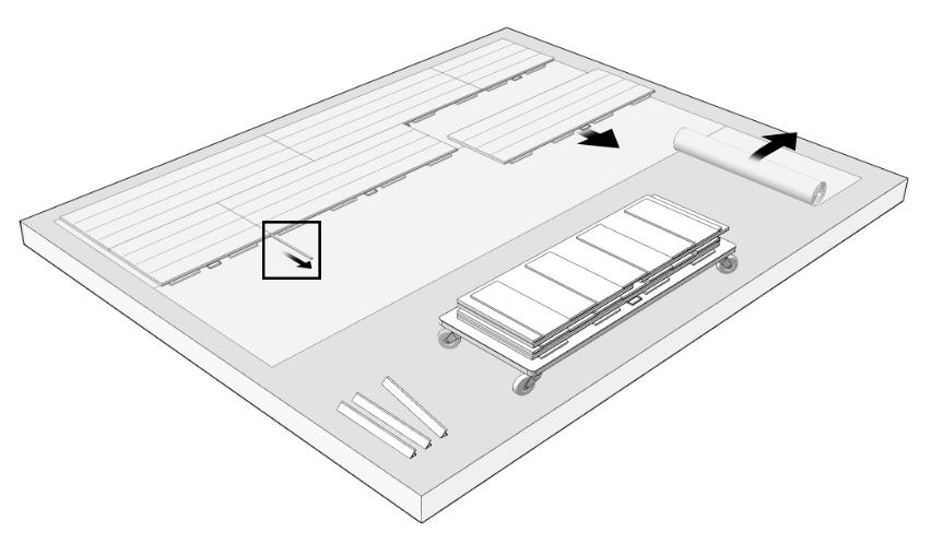 Remove loose joining tongues using the removal hook, and dismantle the panels row by row starting with the last installed panel.