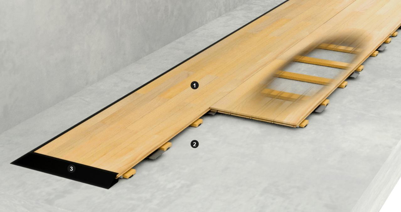 Pro Complete 44 系统由 22 毫米实心硬木镶木地板组成。地板被预先组装成轻质手提板。在每块地板下面,几个预安装的桦木板条与柔软的聚氨酯泡沫安装在一起,以发挥适当的减震和弹性作用。