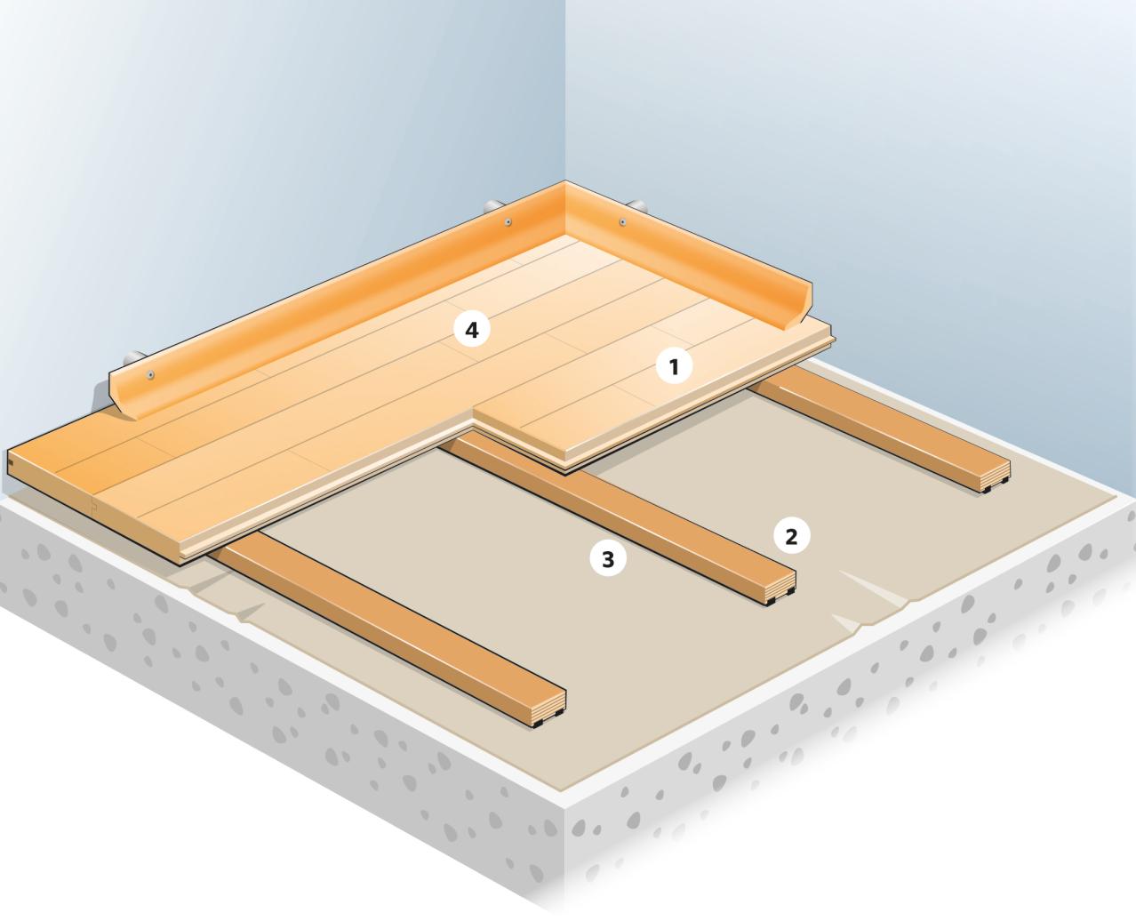 实木地板被钉到一层由工程板条构成的弹性子结构上,板条底部预先安装了专门开发且以独特方式排列的橡胶条。